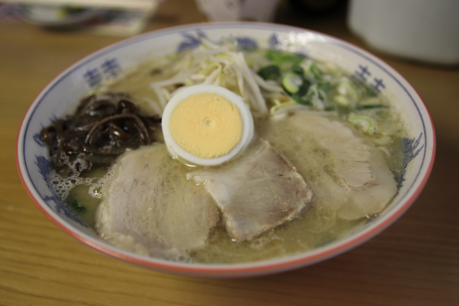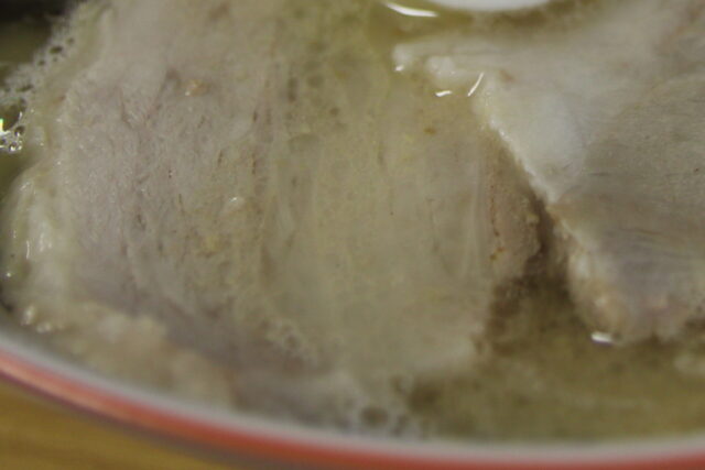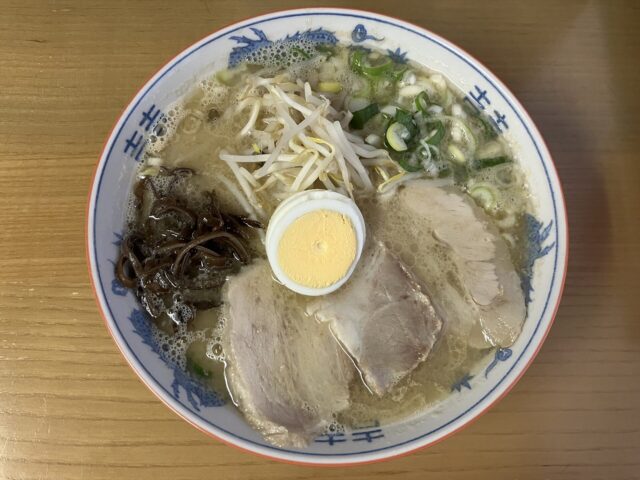 出てきたラーメンはやはり郷愁漂うあのラーメン。具材はバラチャーシュー4枚とスライスゆで卵、茹で木耳、茹でもやし、ネギ。豚骨出汁に対して今日のタレの利かせ方も控えめ。麺の茹で加減は相変わらず好み。途中で卓上にあったスライスニンニクの醤油漬けを2枚ほど加えて変化を楽しんだ。以前は大をお願いしていたけど並で丁度良い感じになってきた。