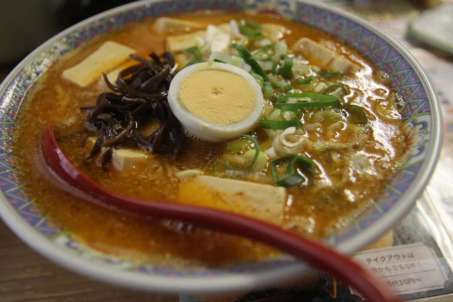 家内が頼んだ麻婆豆腐ラーメンは辛さ控えめとは言うもののやはりスパイシー。ベースは同じく豚骨スープ。具材は大きめに切られた木綿豆腐、スライスゆで卵、ひき肉、ネギ、茹で木耳。こちらは具材を掬いやすいように穴あきレンゲを準備してくれているのもありがたい。二人ともスープは少し残したけれども満足して完食。歴史を感じさせる丼も嬉しい。また来ます。ご馳走様でした。