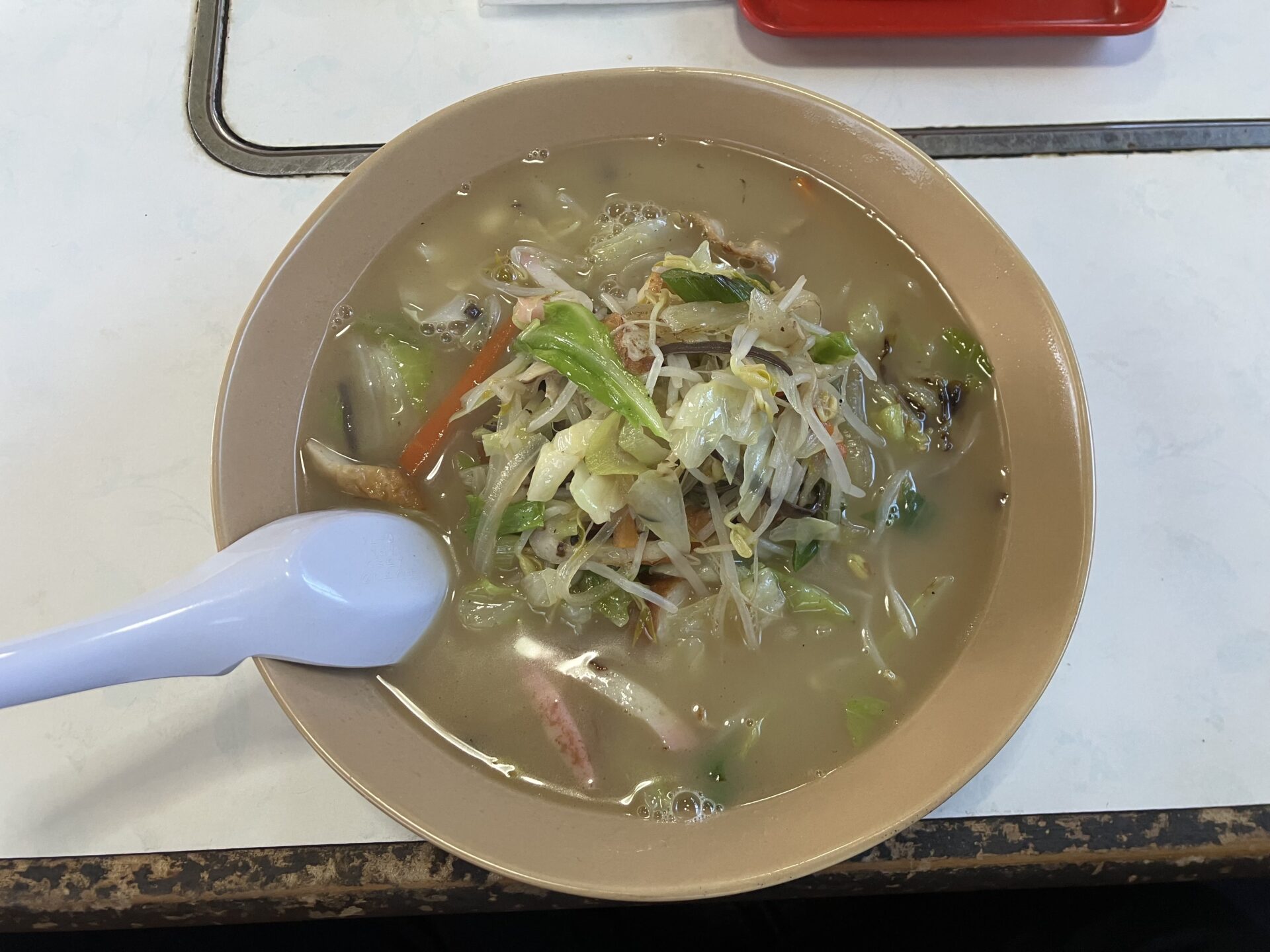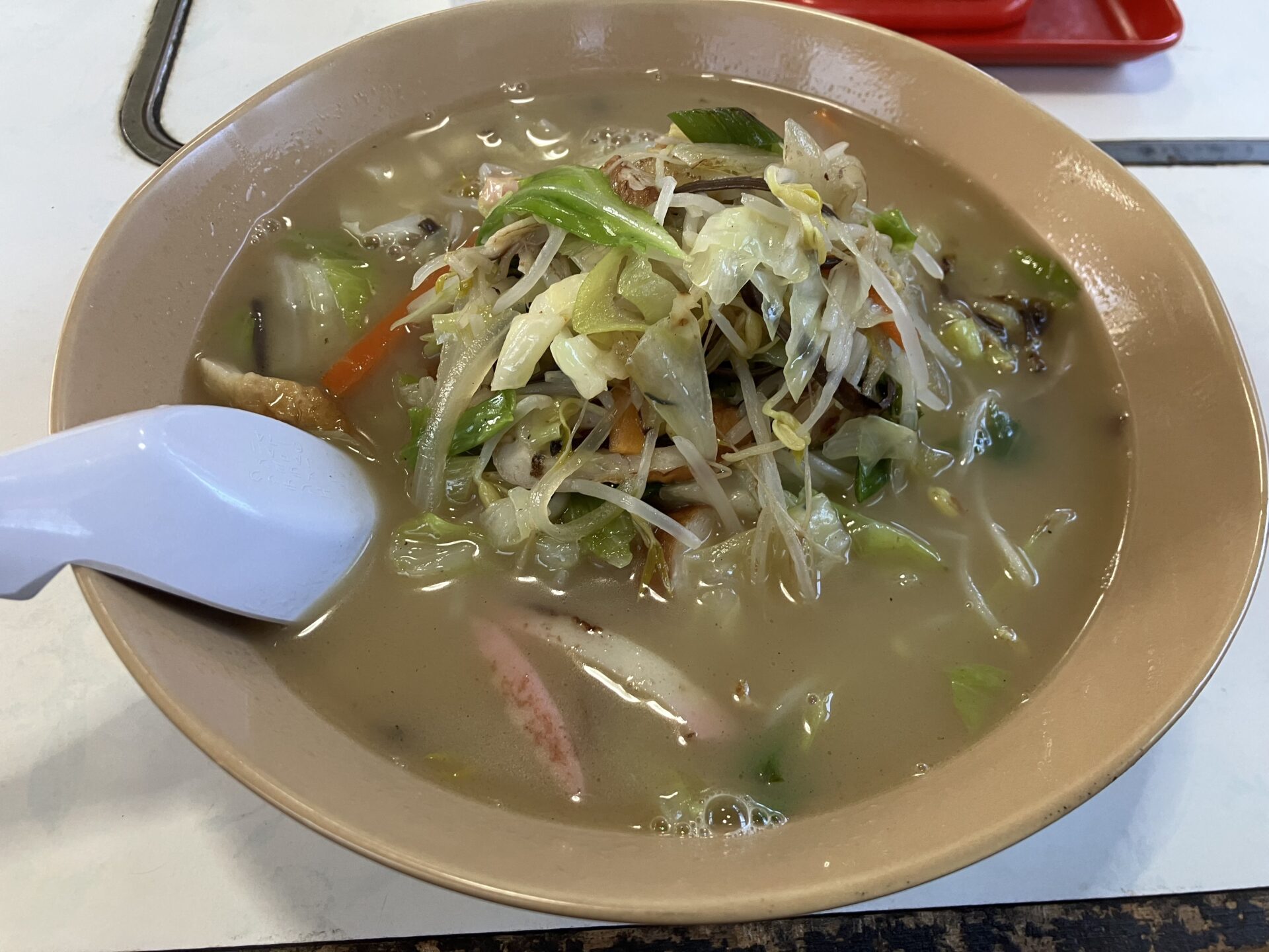 久し振りにいただいたちゃんぽんはやはりとても旨かった。鶏ガラ主体のスープに具材の野菜や豚肉、蒲鉾などのエキスが溶けだしてマイルド。麺は以前の印象より細くなった気がした。普通盛にしたけど野菜の量も多かったので十分満腹に。今日は少し気温も低めだったので温かいスープがとても嬉しかった。焼きそばも皿うどんも気になるけど次回も恐らく、いや間違いなくちゃんぽんを注文するだろう。