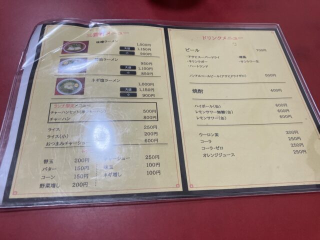 この日は店主?と外国人の店員さん二人で回しておられた。メニューを確認すると看板の黒味噌ラーメンの他に醤油ラーメン、ねぎ塩ラーメン。トッピングにも昔はなかった味玉とか。私は迷うことなく黒味噌ラーメンをお願い。こちらのお店は小の設定もあるので家内は黒味噌ラーメンの小をお願いした。こんな感じのお店だったなと懐かしみながら到着を待つ。後客が2人入ってきた。二人とも黒味噌ラーメン、後から入ってきた方は大を注文。親しげに言葉を交わされている。