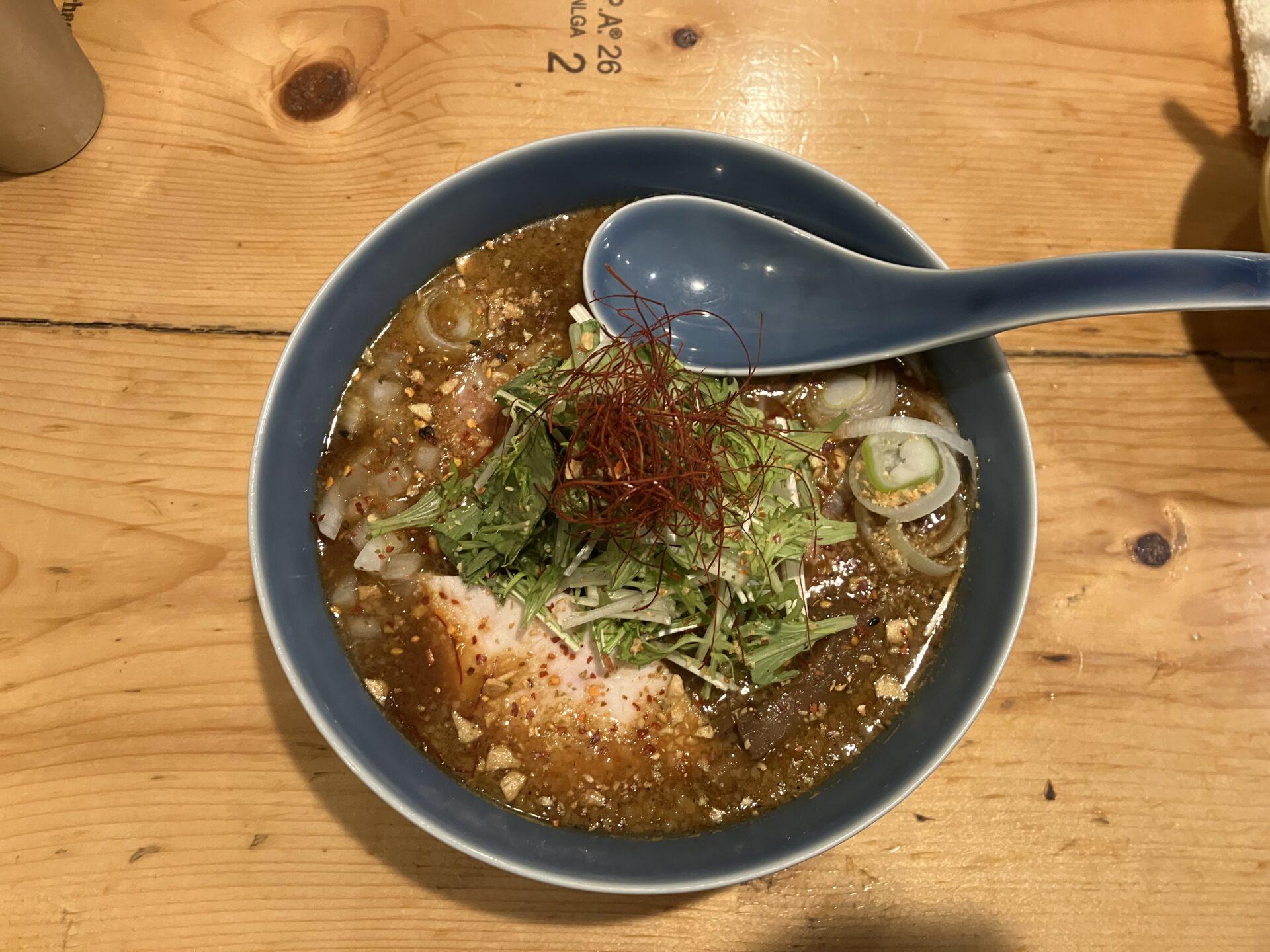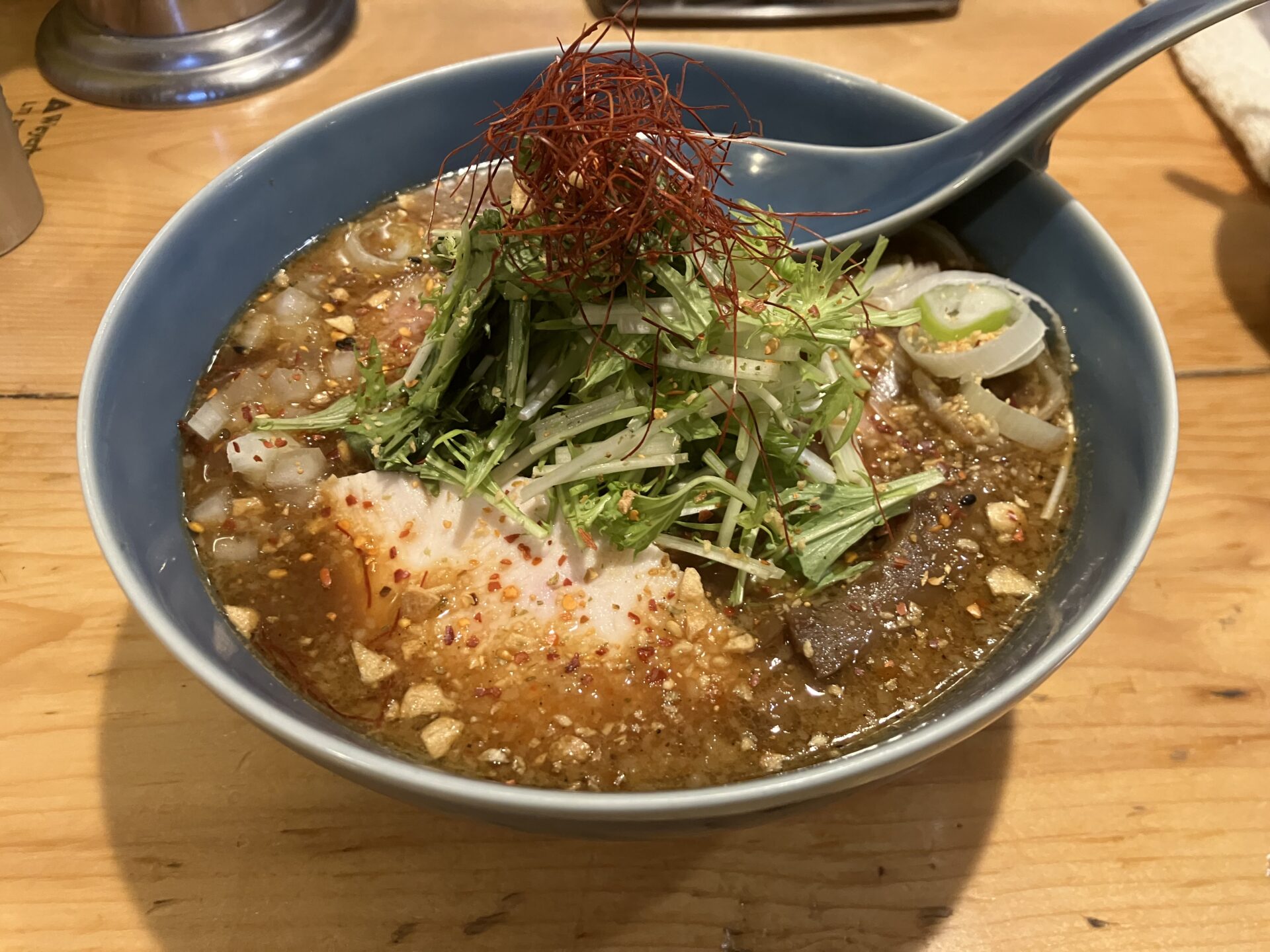 具材は低温調理だと思われる豚のチャーシュー、同じく低温調理の鶏胸肉、水菜、刻み玉ねぎ、白ねぎ、糸唐辛子。味噌の加減は濃いめ。むせるほどではない辛さが心地よい。麺はスープをよく絡める中太やや縮れ。刻み玉ねぎを使った食べるスープ感はやはりこの店ならでは。熱いので少し苦戦したが完食。
