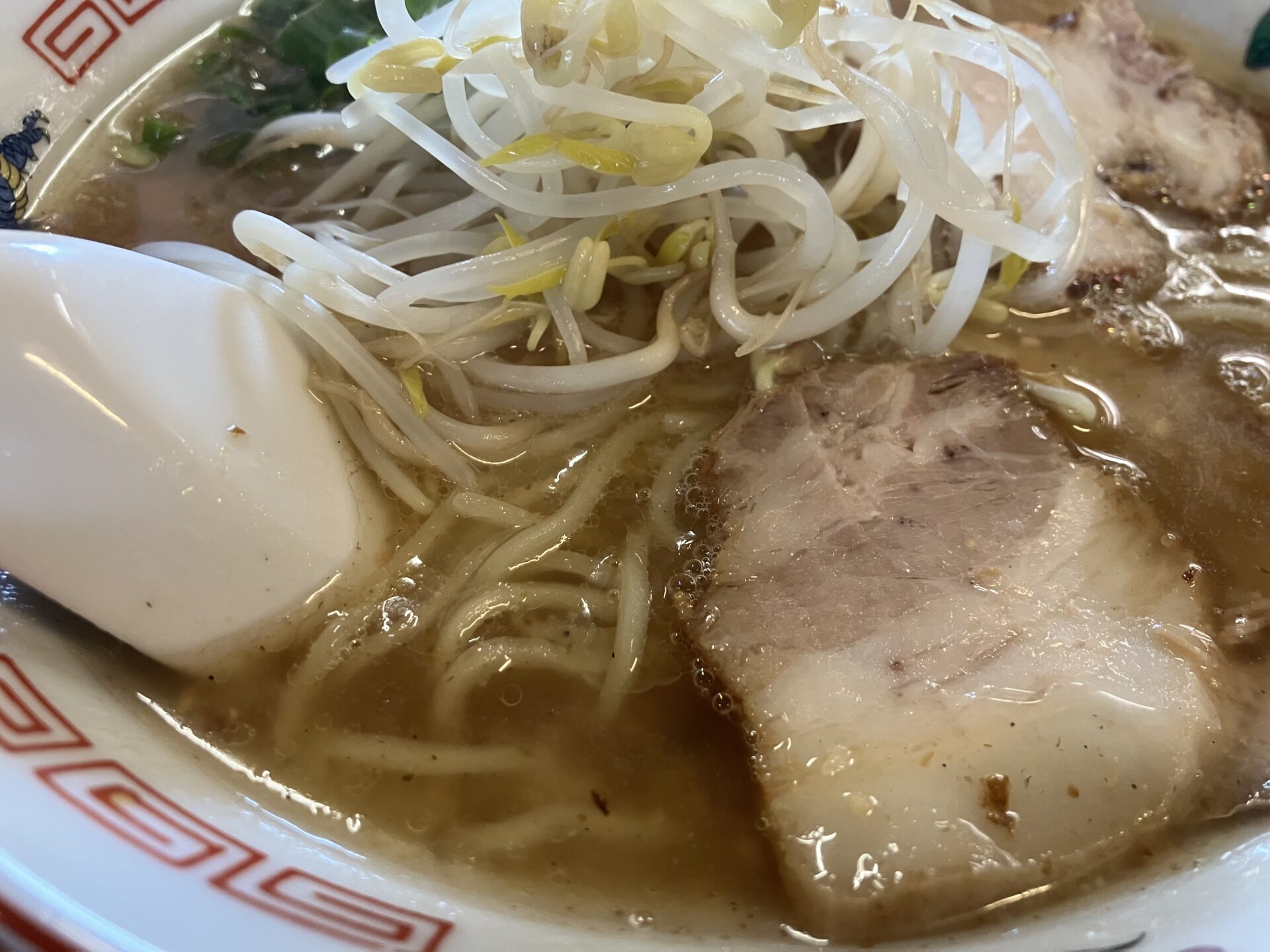 らーめんはしっかりした豚骨に魚介を感じる醤油ダレを合わせたもの。タレの利かせ方は前回よりも強く感じた。脂の浮きも若干多め。(こってり好きにはさらに脂を増すことも出来るらしい)具材は脂身トロトロのバラチャーシュー3枚としゃきしゃきのもやし、青ネギ。